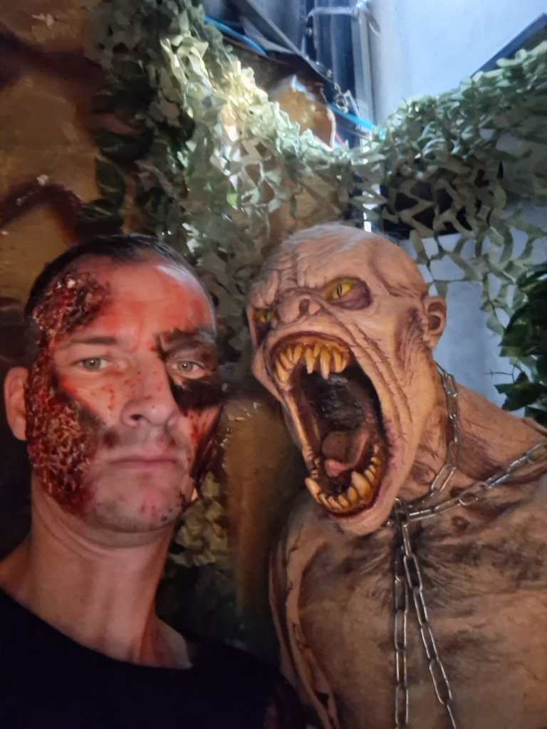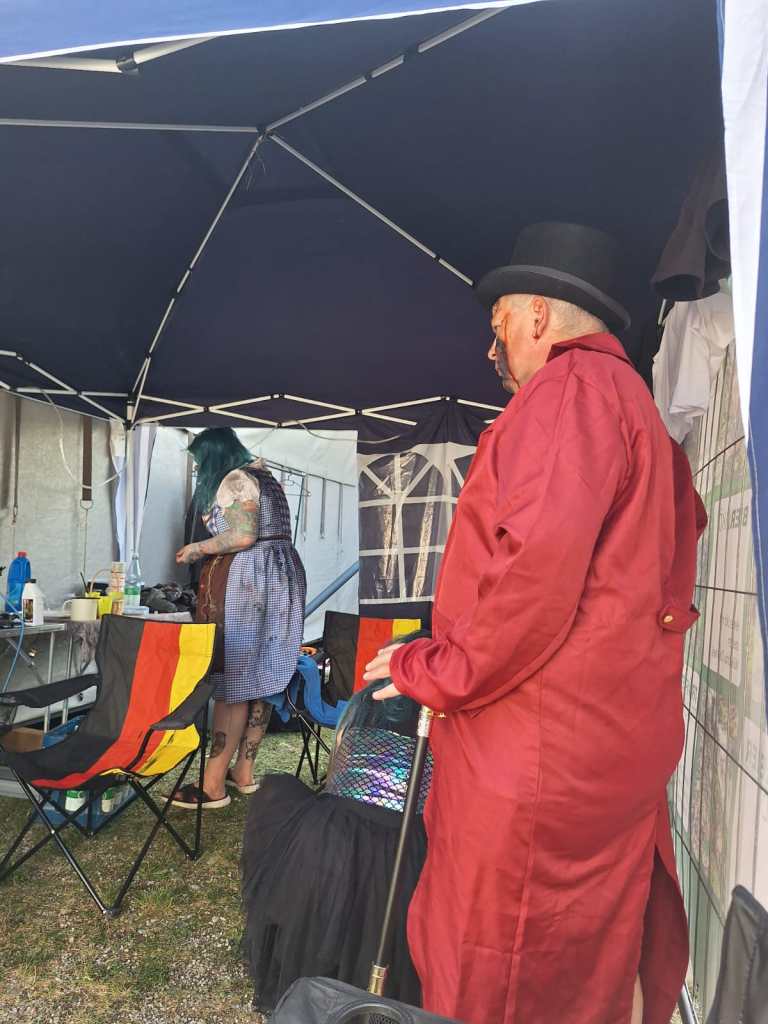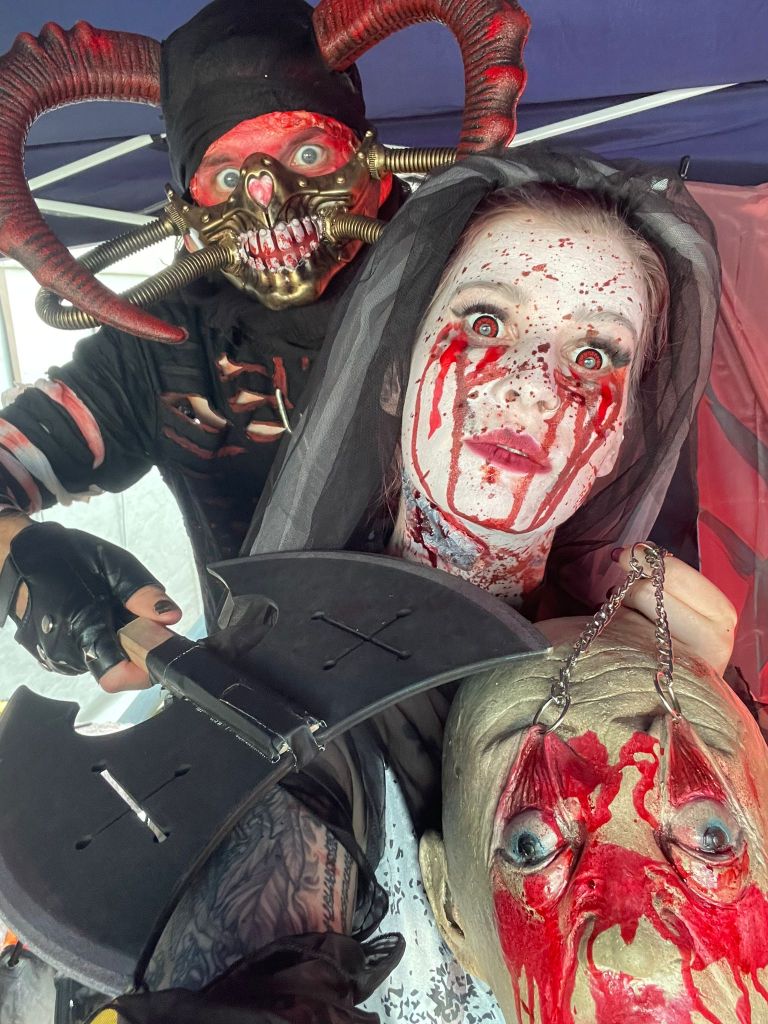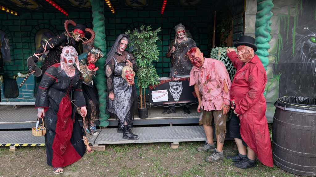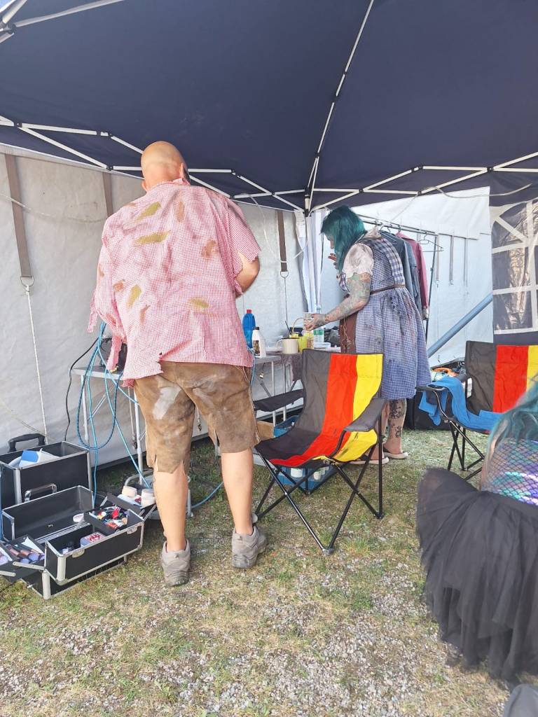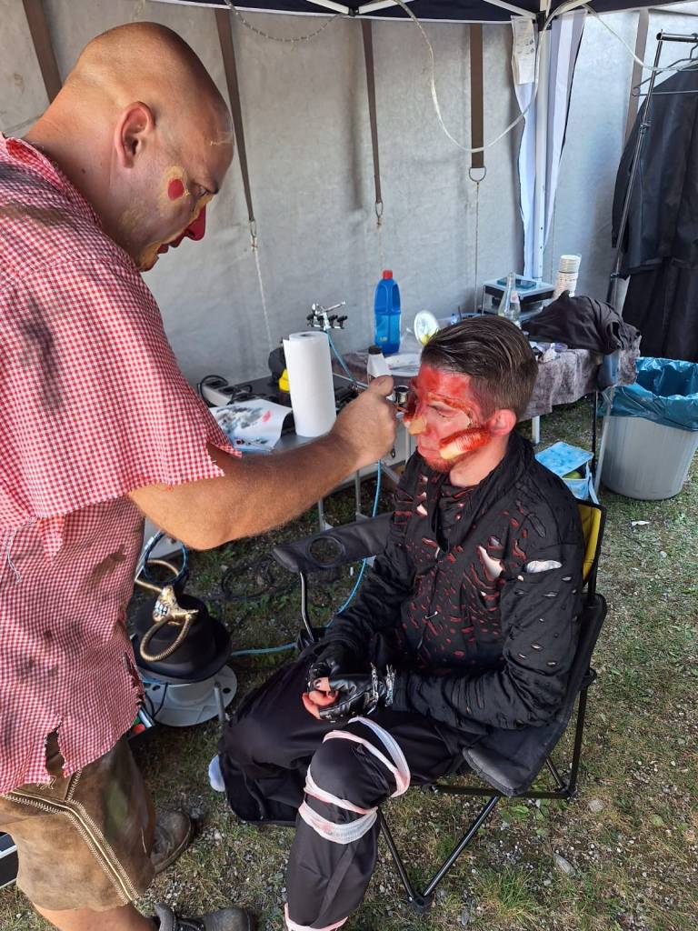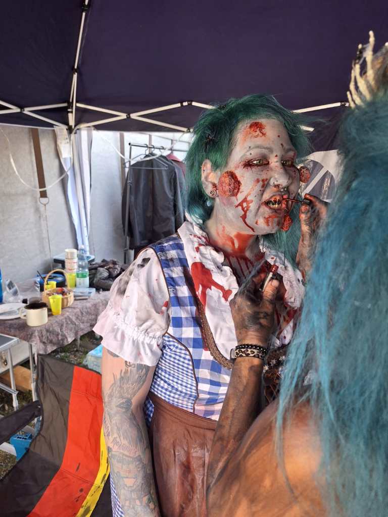Doch wer glaubt, dass hinter den Kulissen alles geordnet und professionell wie in einem Filmset abläuft, täuscht sich gewaltig. Backstage regierte das Chaos: Make-up-Koffer, Perücken, Kunstblutflaschen und halb angezogene Zombies stolperten durcheinander. Aber genau da liegt unser Geheimnis – inmitten des Durcheinanders haben wir uns ein eigenes kleines Reich geschaffen, getragen von Teamgeist, schwarzem Humor und der unerschütterlichen Freude am Grusel.